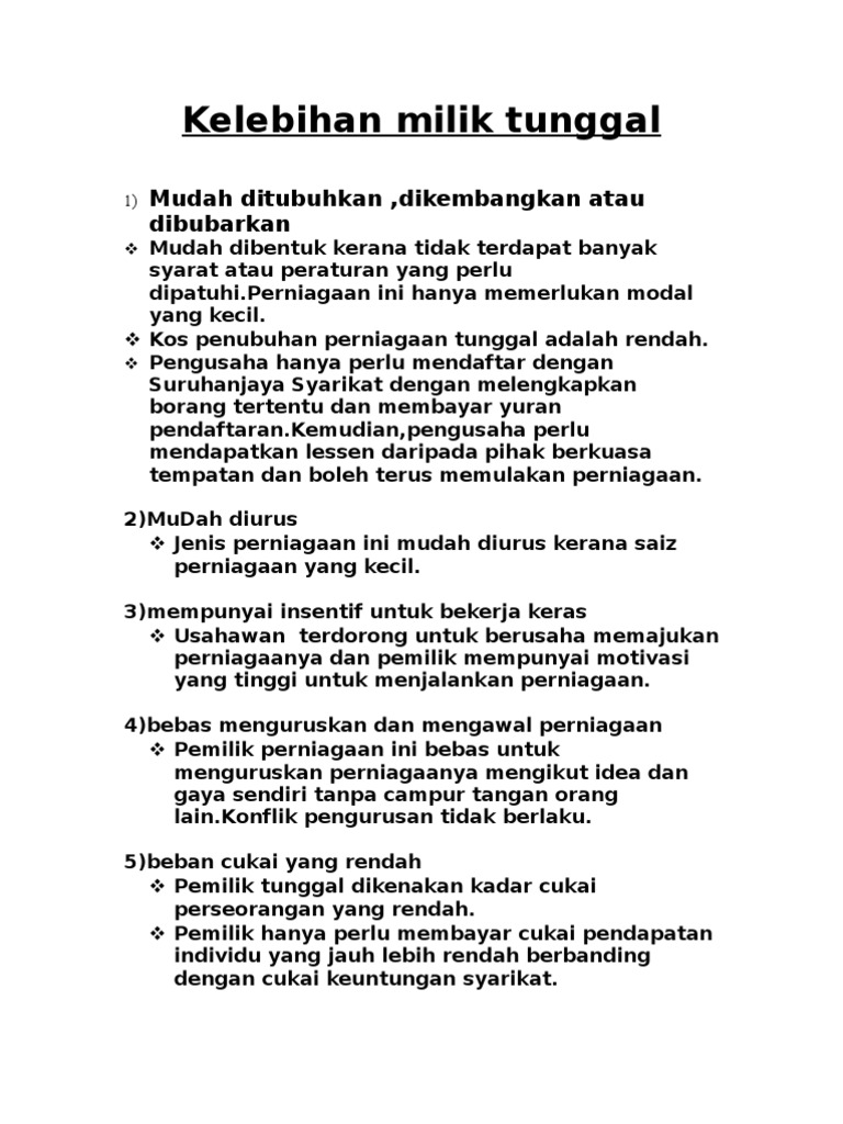 Kelebihan Perniagaan Milikan Tunggal from image.slidesharecdn.com Bentuk pemilikan perniagaan milikan tunggal 1. Actividad online de milikan tunggal para tingkatan 4. Kelebihan dan kekurangan milikan tunggal. Harta peribadi boleh digunakan untuk membayar hutang perniagaan 2. 6 ciri milikan tunggal milikan milikan tunggal dimiliki oleh seorang individu secara bersendirian. Mudah untuk kekurangan milikan tunggal 1. Enterprise atau milikan tunggal merupakan salah satu entiti perniagaan yang popular di malaysia. Pengenalan perniagaan (a) kedai pakaian ctz adalah sebuah perniagaan milikan tunggal yang dimiliki oleh siti zakirah binti azmi.