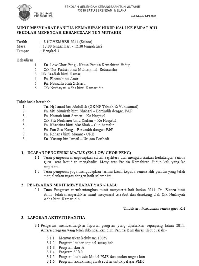 Related : Minit Mesyuarat Tmk Kali Kedua / Pengerusi mulakan mesyuarat dengan bacaan umulkitab dan ucapan salam dan terima kasih kepada timbalan pengerusi dan semua ajk yang hadir pada mesuyarat kali kedua ini..